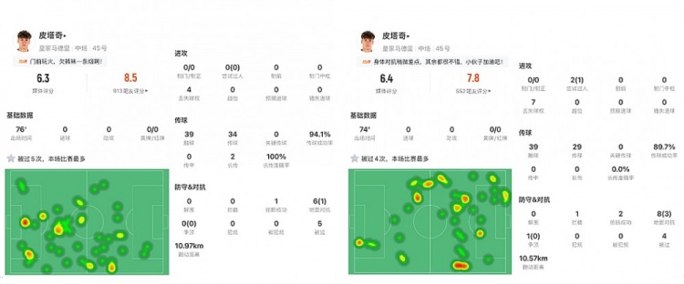 2026年3月3日,西甲第26轮,皇马主场对阵赫塔费,皮塔奇首次代表白衣军团一线队首发。在55分钟的出场时间内,皮塔奇完成55次触球,47脚传球有42次到位,传球成功率高达89%,创造了1次进球机会,对于一名组织型中场来说,这样的数据已经足够优秀,不过考虑到皮塔奇也丢掉了7次球权,5次地面争抢有4次失败,其防守和抗压能力受到了质疑。